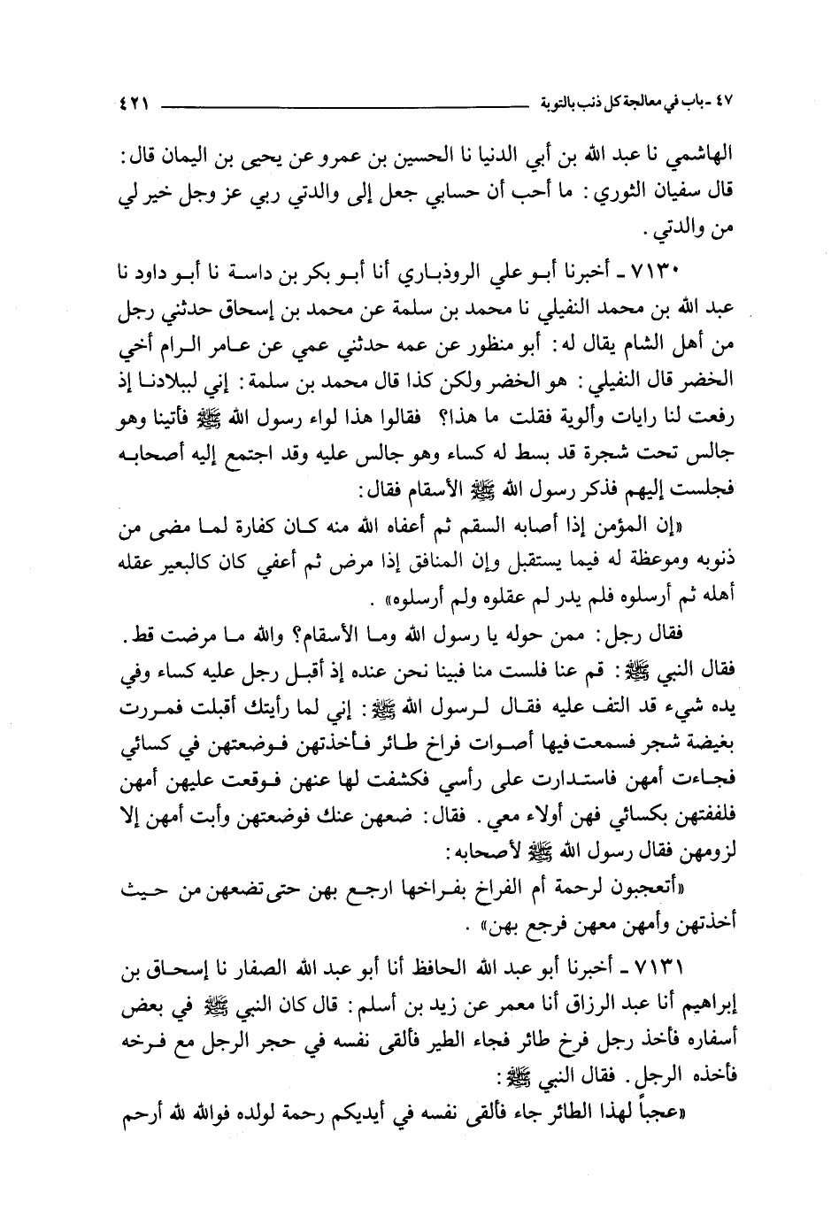 7131 - أخبرنا أبو عبد الله الحافظ أنا أبو عبد الله الصفار نا إسحاق بن إبراهيم أنا عبد الرزاق أنا معمر عن زيد بن أسلم : قال : كان النبي صلى الله عليه و سلم في بعض أسفاره فأخذ رجل فرخ طائر فجاء الطير فألقى نفسه في حجر الرجل مع فرخه فأخذه الرجل فقال النبي صلى الله عليه و سلم :