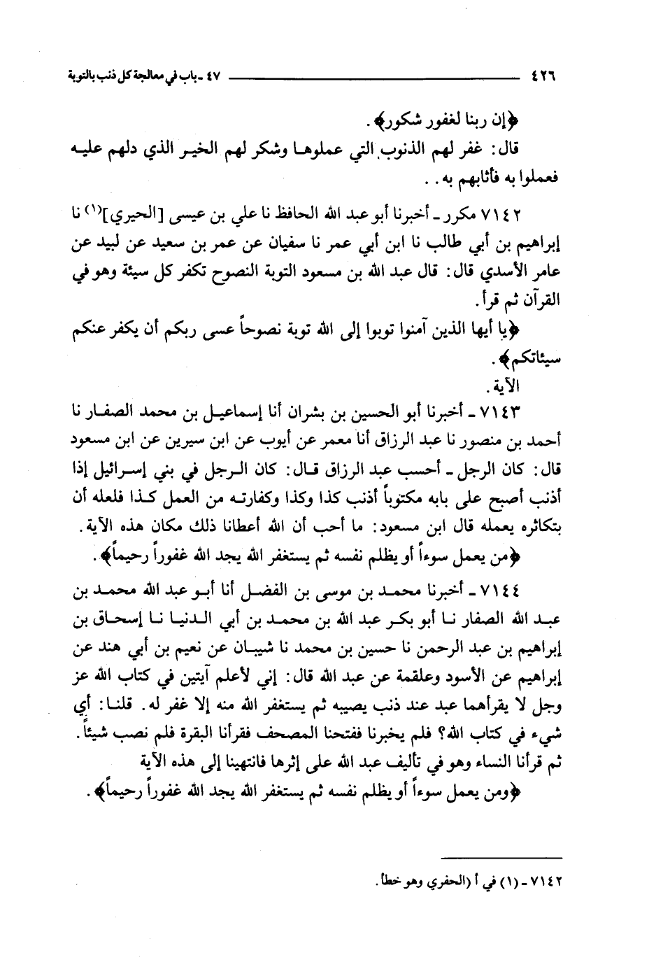 7144 - أخبرنا محمد بن موسى بن الفضل أنا أبو عبد الله محمد بن عبد الله الصفار نا أبو بكر عبد الله بن محمد بن أبي الدنيا نا إسحاق بن إبراهيم بن عبد الرحمن نا حسين بن محمد نا شيبان عن نعيم بن أبي هند عن إبراهيم عن الأسود و علقمة عن عبد الله قال : إني لأعلم آيتين في كتاب الله عز و جل لا يقرأهما عبد عند ذنب يصيبه ثم يستغفر الله منه إلا غفر له قلنا : أي شيء في كتاب الله ؟ فلم يخبرنا ففتحنا المصحف فقرأنا البقرة فلم نصب شيئا ثم قرأنا النساء وهو في تأليف عبد الله إثرها فانتهينا إلى هذه الآية :
