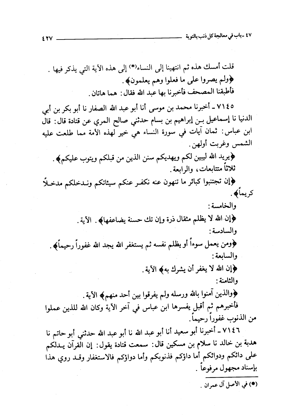 7146 - أخبرنا أبو سعيد أنا أبو عبد الله نا أبو عبد الله حدثني أبو حاتم نا هدبة بن خالد نا سلام بن مسكين قال : سمعت قتادة يقول : إن القرآن يدلكم على دائكم ودوائكم أما داؤكم فذنوبكم وأما دواؤكم فالاستغفار وقد روي هذا بإسناد مجهول مرفوعا