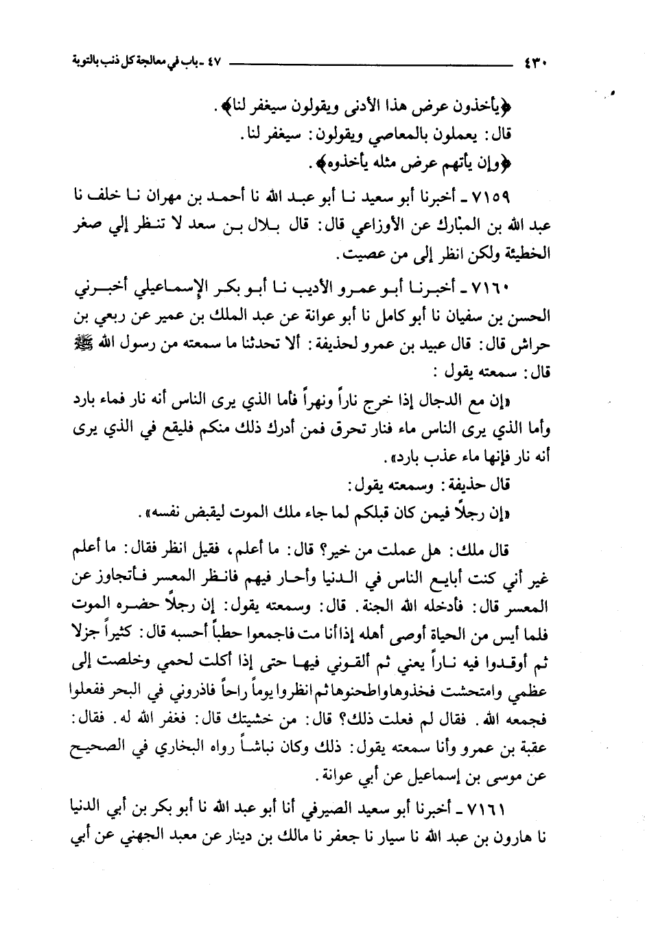7160 - أخبرنا أبو عمرو الأديب نا أبو بكر الإسماعيلي أخبرني الحسن بن سفيان نا أبو كامل نا أبو عوانة عن عبد الملك بن عمير عن ربعي بن حراش قال : قال عبيد بن عمرو لحذيفة : ألا تحدثنا ما سمعته من رسول الله صلى الله عليه و سلم قال : سمعته يقول :