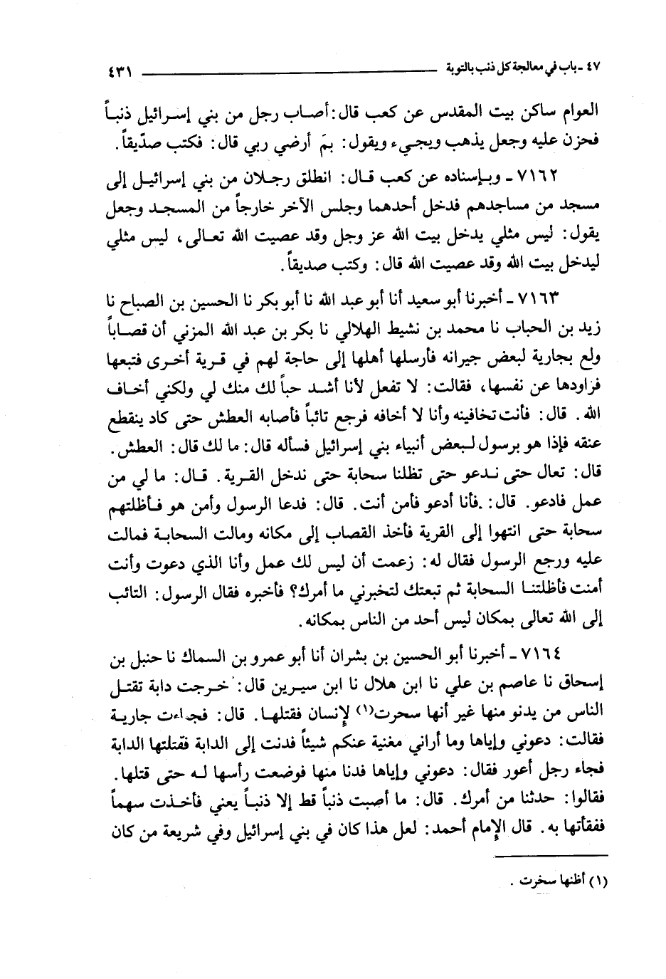 7163 - أخبرنا أبو سعيد أنا أبو عبد الله نا أبو بكر نا الحسين بن الصباح نا زيد بن الحباب نا محمد بن نشيط الهلالي نا بكر بن عبد الله المزني : أن قصابا ولع بجارية فأرسها أهلها إلى حاجة لهم في قرية أخرى فتبعها فراودها عن نفسها فقالت : لا تفعل لأنا أشد جبا لك منك لي ولكني أخاف الله قال : فأنت تخافينه وأنا لا أخافه فرجع تائبا فأصابه العطش حتى كاد ينقطع عنقه فإذا هو برسول لبعض أنبياء بني إسرائيل فسأله قال : ما لك قال : العطش قال : تعال ندعو حتى تظلنا سحابة حتى ندخل القرية قال : ما لي من عمل فادعو قال : فأنا أدعو فأمن أنت قال : فدعا الرسول وأمن هو فأظلتهم سحابة حتى انتهوا إلى القرية فأخذ القصاب إلى مكانه ومالت السحابة فمالت عليه ورجع الرسول فقال له : زعمت أن ليس لك عمل وأنا الذي دعوت وأنت أمنت فأظلتنا السحابة ثم تبعتك لتخبرني ما أمرك ؟ فأخبره فقال الرسول : التائب إلى الله تعالى بمكان ليس أحد من الناس بمكانه