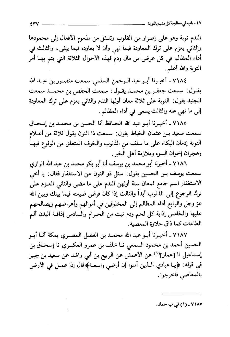 7184 - أخبرنا أبو عبد الرحمن السلمي سمعت منصور بن عبد الله يقول : سمعت جعفر بن محمد يقول : سمعت الحفص بن محمد سمعت الجنيد يقول : التوبة على ثلاث معان أولها الندم والثاني يعزم على ترك المعاودة إلى ما نهي عنه والثالث يسعى في أداء المظالم