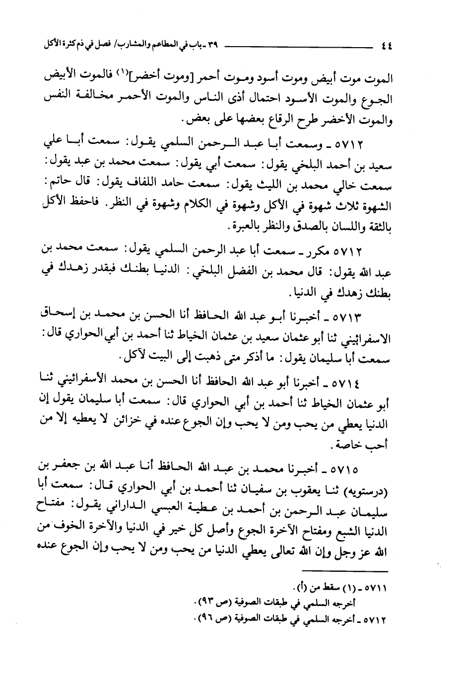 5712 - وسمعت أبا عبد الرحمن السلمي يقول : سمعت أبا علي سعيد بن أحمد البلخي يقول : سمعت محمد بن عبد يقول : سمعت خالي محمد بن الليث يقول : سمعت حامد اللفاف يقول : قال حاتم : الشهوة ثلاث شهوة شهوة في الأكل وشهوة في الكلام وشهوة في النظر فاحفظ الأكل بالثقة واللسان بالصدق والنظر بالعبرة