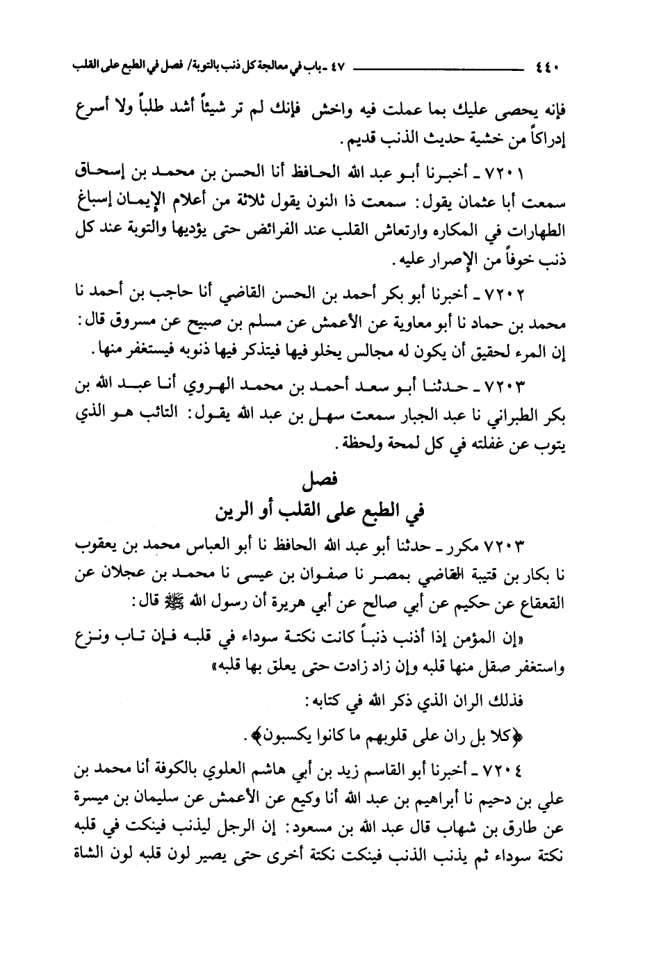 7204 - أخبرنا أبو القاسم زيد بن أبي هاشم العلوي بالكوفة أنا محمد بن علي بن دحيم نا إبراهيم بن عبد الله أنا وكيع عن الأعمش عن سليمان بن ميسرة عن طارق بن شهاب قال عبد الله بن مسعود : إن الرجل ليذنب فينكت في قلبه نكتة سوداء ثم يذنب الذنب فينكت نكتة أخرى حتى يصير لون قلبه لون الشاة الربداء يعني السوداء كذا وجدته عن عبد الله