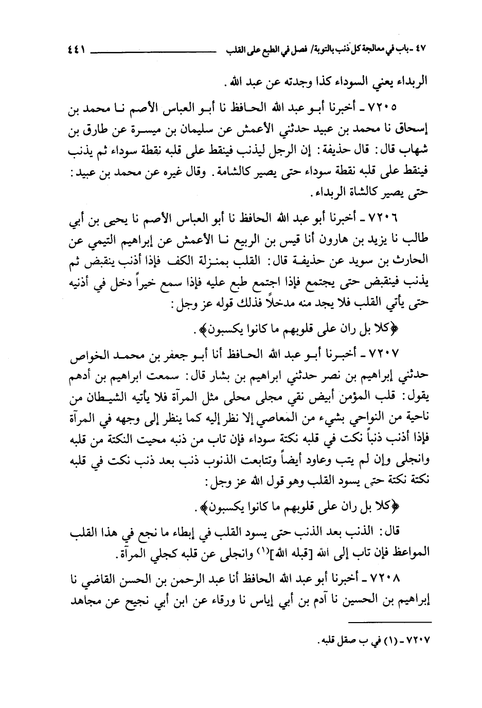 7207 - أخبرنا أبو عبد الله الحافظ أنا أبو جعفر بن محمد الخواص حدثني إبراهيم بن نصر حدثني إبراهيم بن بشار قال : سمعت إبراهيم بن أدهم يقول : قلب المؤمن أبيض نقي مجلى محلى مثل المرآة فلا يأتيه الشيطان من ناحية من النواحي بشيء من المعاصي إلا نظر إليه كما ينظر إلى وجهه في المرآة فإذا أذنب ذنبا نكت في قلبه نكتة سوداء فإن تاب من ذنبه محيت النكتة من قلبه وانجلى وإن لم يتب وعاود أيضا وتتابعت الذنوب ذنب بعد ذنب نكت في قلبه نكتة نكتة حتى يسود القلب وهو قول الله عز و جل :