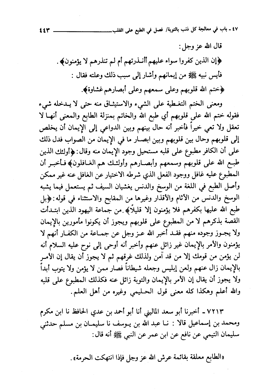 زاد ابن يوسف وعمل بالمعاصي واجترأ على الرب بعث الله الطابع فيطبع على قلبه فلا يعقل بعد ذلك شيئا وقال ابن يوسف : على قلوبهم فلا يعقلون شيئا تفرد به سليمان بن مسلم الخشاب وليس بالقوي