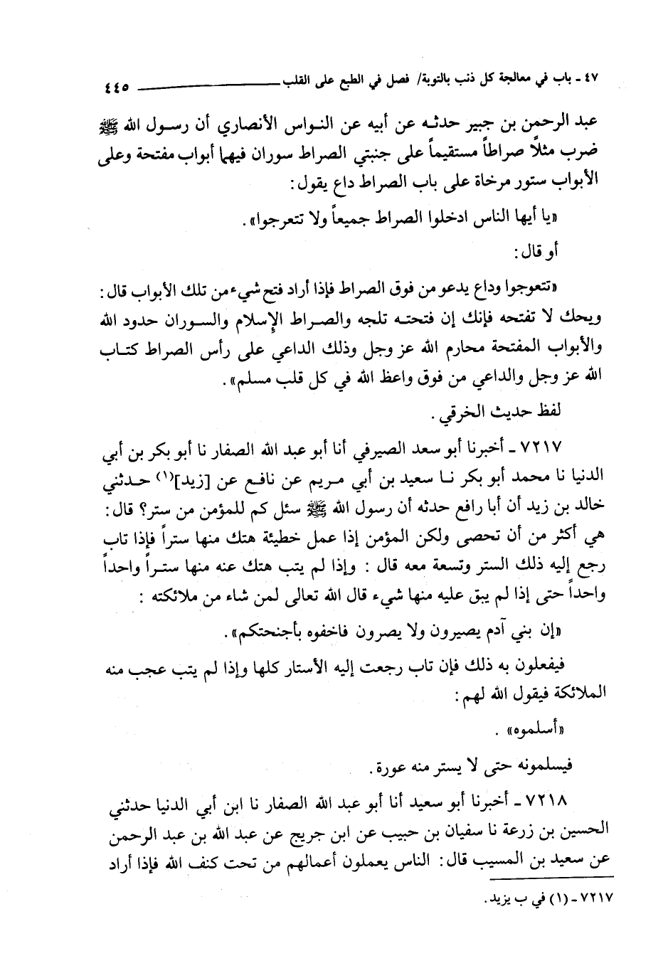 7217 - أخبرنا أبو سعد الصيرفي أنا أبو عبد الله الصفار نا أبو بكر بن أبي الدنيا نا محمد أبو بكر نا سعيد بن أبي مريم عن نافع عن زيد حدثني خالد بن زيد أن أبا رافع حدثه : أن رسول الله صلى الله عليه و سلم سئل كم للمؤمن من ستر ؟ قال : هي أكثر من أن تحصى ولكن المؤمن إذا عمل خطيئة هتك منها سترا فإذا تاب رجع إليه ذلك الستر وتسعة معه قال : وإذا لم يتب هتك عنه منها سترا واحدا واحدا حتى إذا لم يبق عليه منها شيء قال الله تعالى لمن ساء من ملائكته :