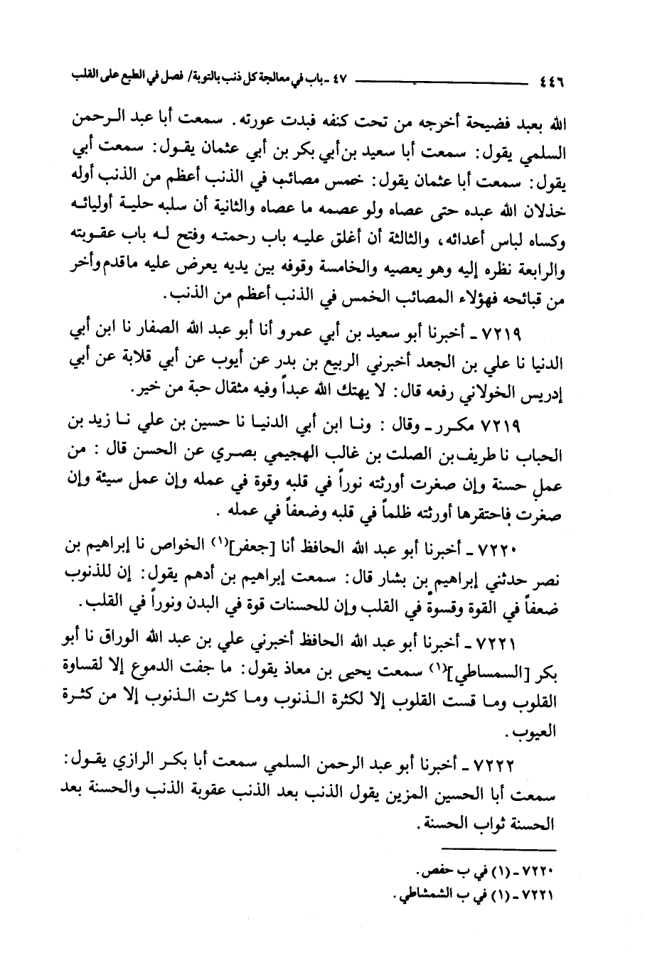 7221 - أخبرنا أبو عبد الله الحافظ أخبرني علي بن عبد الله الوراق نا أبو بكر السمساطي سمعت يحيى بن معاذ يقول : ما جفت الدموع إلا لقساوة القلوب وما قست القلوب إلا لكثرة الذنوب وما كثرت الذنوب إلا من كثرة العيوب
