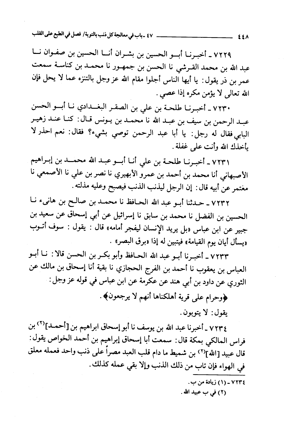 7234 - أخبرنا عبد الله بن يوسف نا أبو إسحاق إبراهيم بن أحمد بن فراس المالكي بمكة قال : سمعت أبا إسحاق إبراهيم بن أحمد الخواص يقول : قال عبيد الله بن شميط : ما دام قلب العبد مصرا على ذنب واحد فعمله معلق في الهواء فإن تاب من ذلك الذنب وإلا بقي عمله كذلك