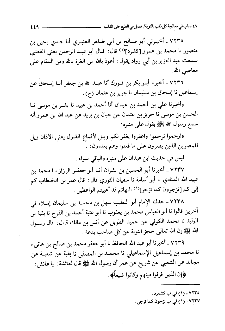 7236 - أخبرنا أبو بكر بن فورك أنا عبد الله بن جعفر أنا إسحاق عن إسماعيل نا إسحاق بن سليمان نا جرير بن عثمان ح