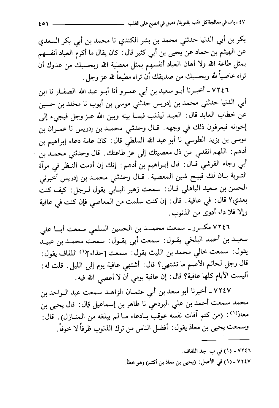 7246 - أخبرنا أبو سعيد بن أبي عمرو أنا أبو عبد الله الصفار نا ابن أبي الدنيا حدثني محمد بن إدريس حدثني موسى بن أيوب نا مخلد بن حسين عن خطاب العابد قال : العبد ليذنب فيما بينه وبين الله عز و جل فيجيء إلى إخوانه فيعرفون ذلك في وجهه قال وحدثني محمد بن إدريس نا عمران بن موسى بن يزيد الطوسي نا أبو عبد الله الملطي قال : كان عامة دعاء إبراهيم بن أدهم : اللهم انقلني من ذل معصيتك إلى عز طاعتك قال وحدثني محمد بن أبي رجاء القرشي قال : قال إبراهيم بن أدهم : إنك إن أدمت النظر في مرآة التوبة بان لك قبيح شين المعصية قال وحدثني محمد بن إدريس أخبرني الحسن بن سعيد الباهلي قال : سمعت زهير البابي يقول لرجل : كيف كنت بعدي ؟ قال : في عافية قال : إن كنت سلمت من المعاصي فإن كنت في عافية وإلا فلا داء أدوى من الذنوب