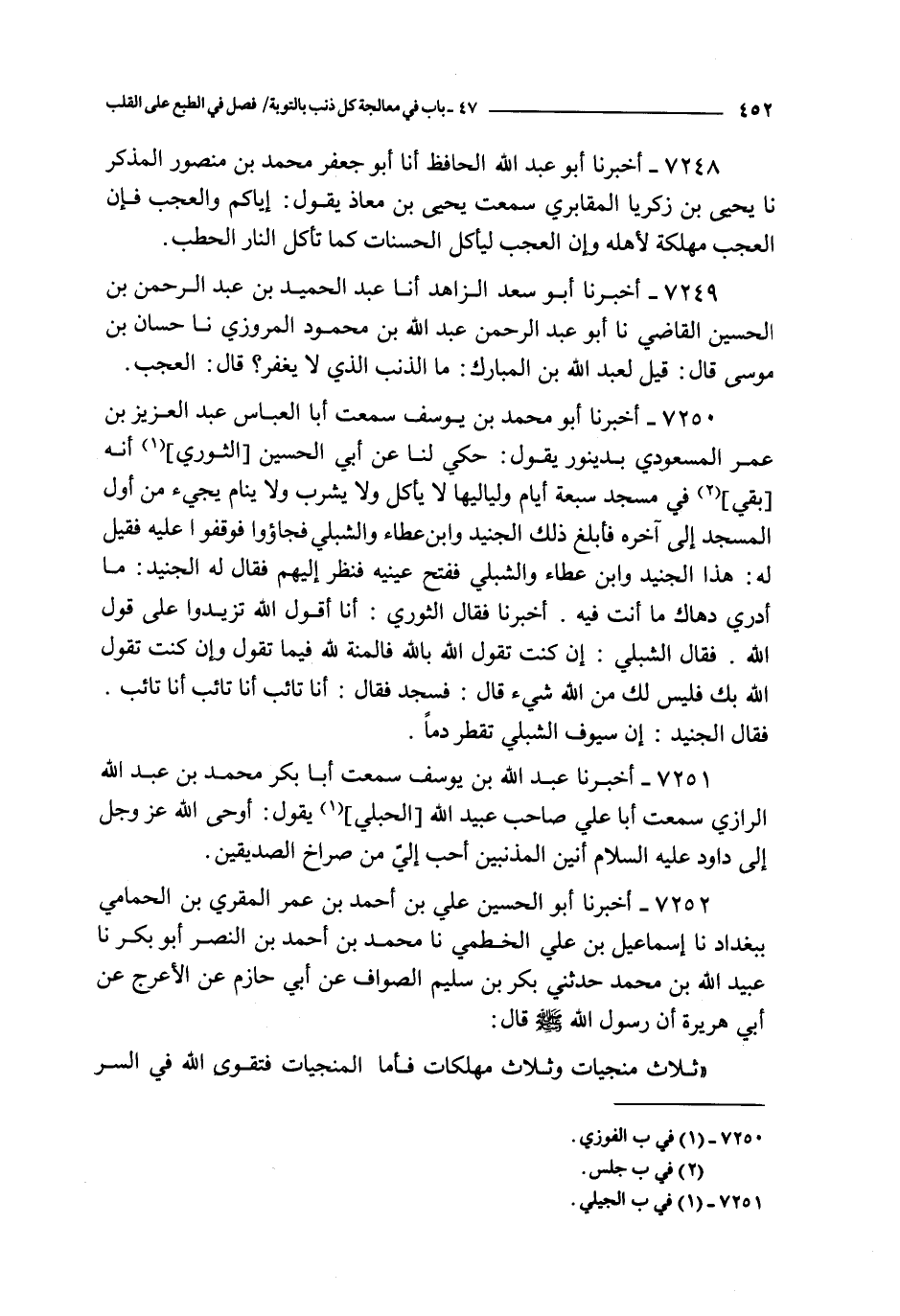 7249 - أخبرنا أبو سعد الزاهد أنا عبد الحميد بن عبد الرحمن بن الحسين القاضي نا أبو عبد الرحمن عبد الله بن محمود المروزي نا حسان بن موسى قال : قيل لعبد الله بن المبارك : ما الذنب الذي لا يغفر ؟ قال : العجب