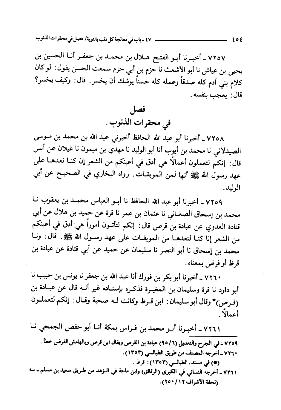 7259 - أخبرنا أبو عبد الله الحافظ نا أبو العباس محمد بن يعقوب نا محمد بن إسحاق الصغاني نا عثمان بن عمر نا قرة عن حميد بن هلال عن أبي قتادة العدوي عن عبادة بن قرص قال : إنكم لتأتون أمورا هي أدق في أعينكم من الشعر إنا كنا لنعدها من الموبقات على عهد رسول الله صلى الله عليه و سلم قال : ونا محمد بن إسحاق نا أبو النصر نا سليمان عن حميد عن أبي قتادة عن عبادة بن قرظ أو فرض معناه