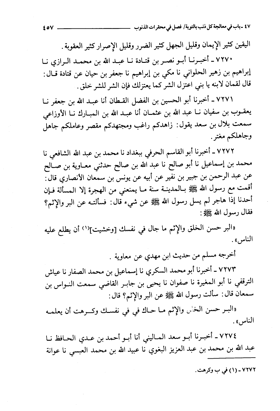 7273 - أخبرنا أبو محمد السكري نا إسماعيل بن محمد الصفار نا عياش الترفقي نا أبو المغيرة نا صفوان نا يحيى بن جابر القاضي سمعت النواس بن سمعان قال : سألت رسول الله صلى الله عليه و سلم عن البر والإثم ؟ قال : البر حسن الخلق والإثم ما حاك في في نفسك وكرهت أن يعلمه الناس