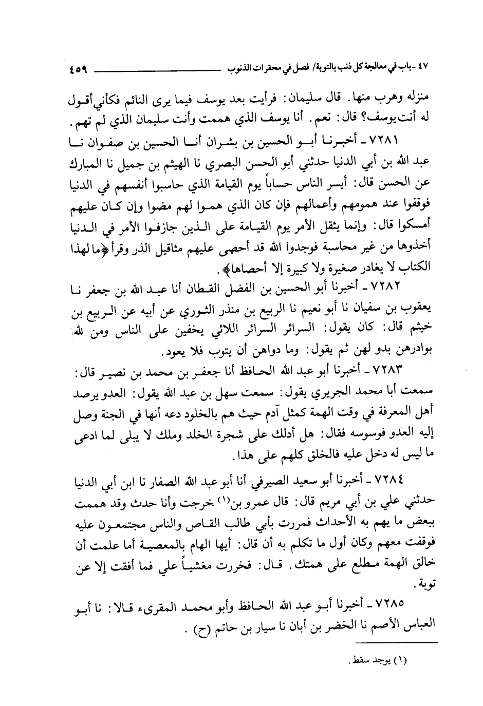 7285 - أخبرنا أبو عبد الله الحافظ و أبو محمد المقرئ قالا : نا أبو العباس الأصم نا الخضر بن أبان نا سيار بن حاتم ح