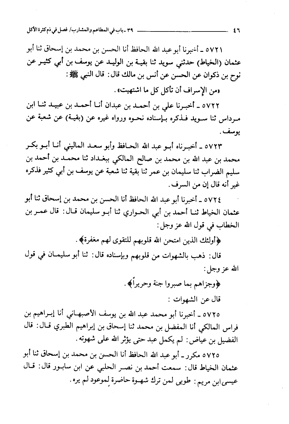 5723 - أخبرناه أبو عبد الله الحافظ و أبو سعد الماليني أنا أبو بكر محمد بن عبد الله بن محمد بن صالح المالكي ببغداد ثنا محمد بن أحمد بن سليم الضراب ثنا سليمان بن عمر ثنا بقية ثنا شعبة عن يوسف بن أبي كثير : فذكره غير أنه قال إن من السرف