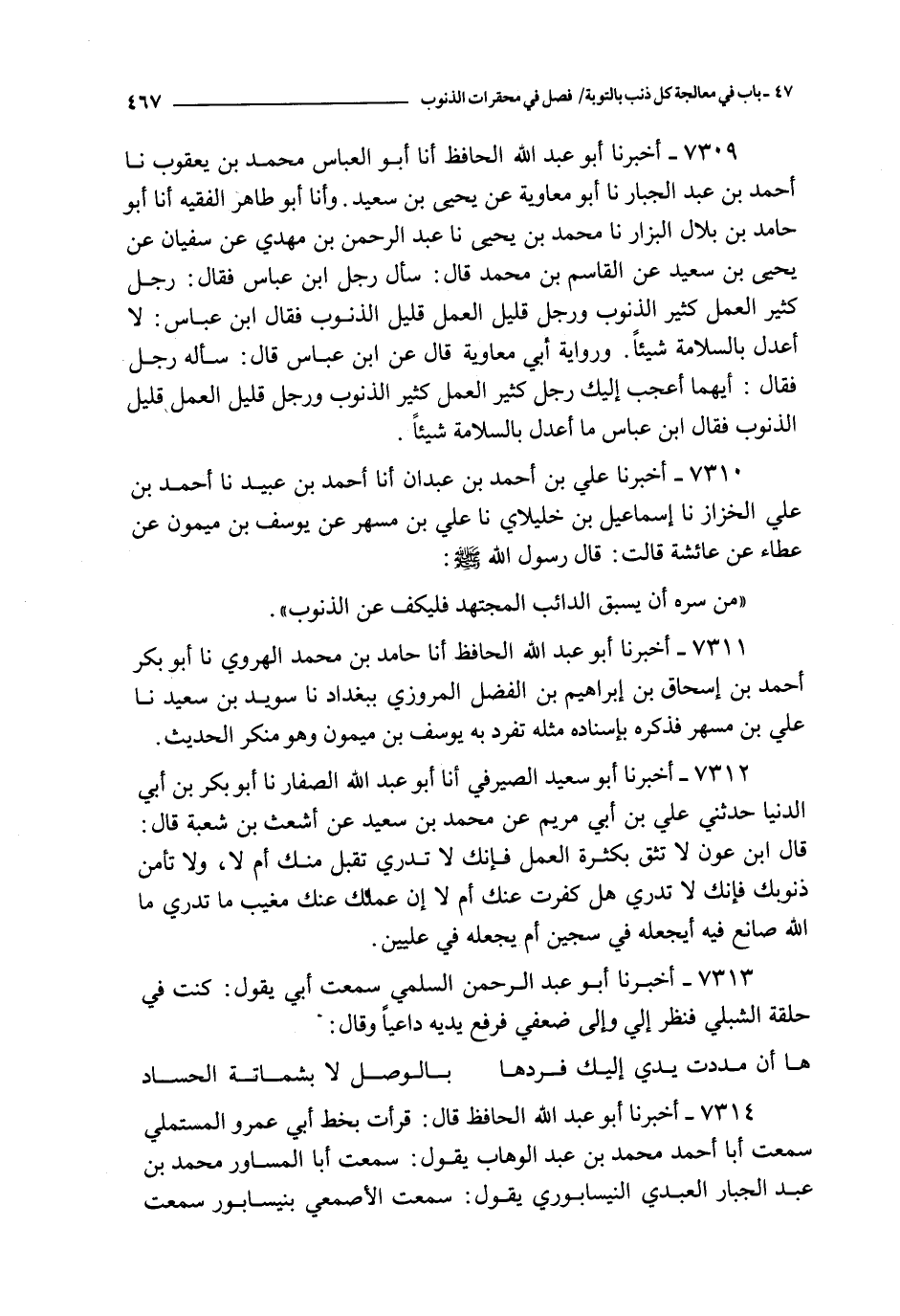 7309 - أخبرنا أبو عبد الله الحافظ أنا أبو العباس محمد بن يعقوب نا أحمد بن عبد الجبار نا أبو معاوية عن يحيى بن سعيد وأنا أبو طاهر الفقيه أنا أبو حامد بن بلال البزاز نا محمد بن يحيى نا عبد الرحمن بن مهدي عن سفيان عن يحيى بن سعيد عن القاسم بن محمد قال : سأل رجل ابن عباس فقال : رجل كثير العمل كثير الذنوب ورجل قليل العمل قليل الذنوب فقال ابن عباس : لا أعدل بالسلامة شيئا ورواية أبي معاوية قال عن ابن عباس قال : سأله رجل فقال : أيهما أعجب إليك رجل كثير العمل كثير الذنوب ورجل قليل العمل قليل الذنوب فقال ابن عباس ما أعدل بالسلامة شيئا