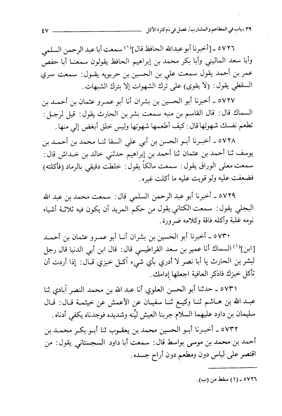 5726 - أخبرنا أبو عبد الله الحافظ قال سمعت أبا عبد الرحمن السلمي و أبا سعد الماليني و أبا بكر محمد بن إبراهيم الحافظ يقولون سمعنا أبا حفص عمر بن أحمد يقول سمعت علي بن الحسين بن حربويه يقول : سمعت سري السقطي يقول : لا يقوى على ترك الشهوات إلا بترك الشبهات