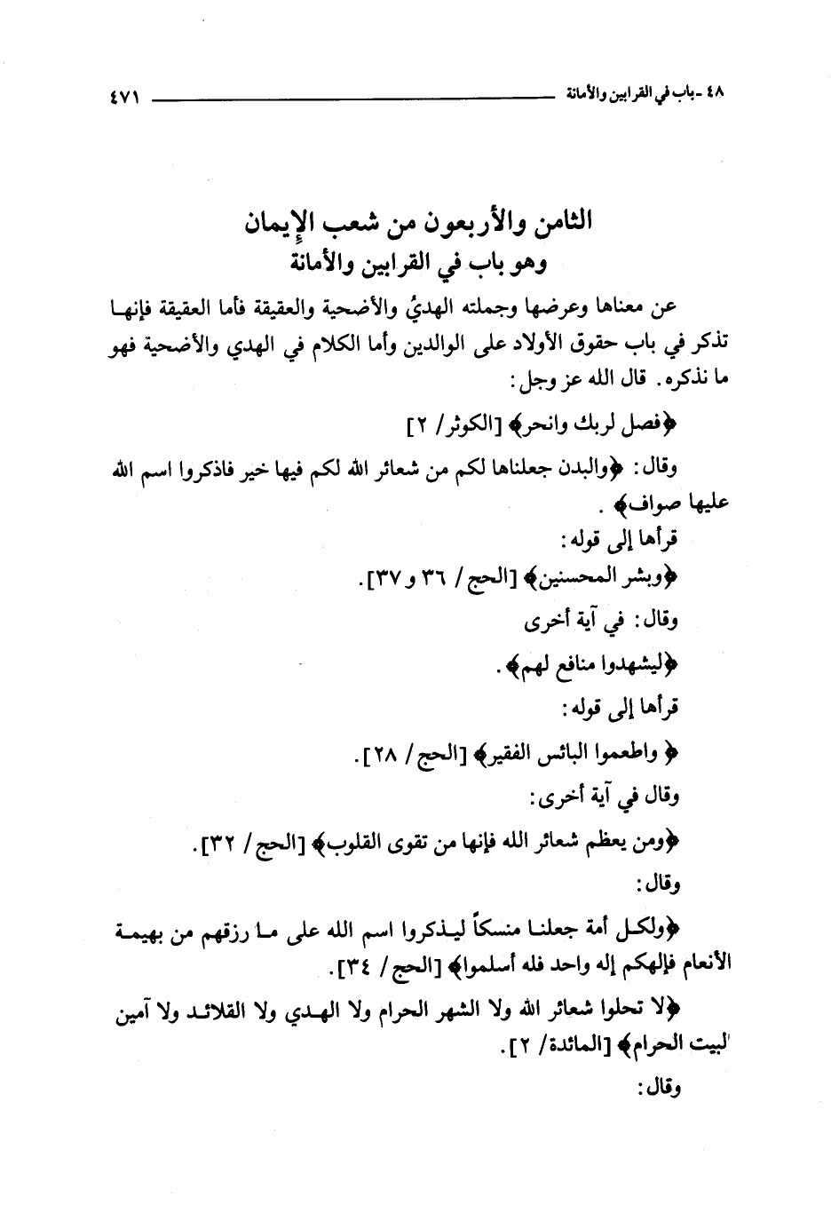 الثامن والأربعون من شعب الإيمان وهو باب في القاربين والأمانة ـ عن معناها وعرضها وجملته الهدي والأضحية والعقيقة فأما العقيقة فإنها تذكر في باب حقوق الأولاد على الوالدين وأما الكلام في الهدي والأضحية فهو ما نذكره قال الله عز و جل : { فصل لربك وانحر } وقال : { والبدن جعلناها لكم من شعائر الله لكم فيها خير فاذكروا اسم الله عليها صواف } قرأها إلى قوله : { وبشر المحسنين } وقال : في آية أخرى { ليشهدوا منافع لهم } قرأها إلى قوله : { وأطعموا البائس الفقير } وقال في آيه أخرى : { ومن يعظم شعائر الله فإنها من تقوى القلوب } وقال : { ولكل أمة جعلنا منسكا ليذكروا اسم الله على ما رزقهم من بهيمة الأنعام فإلهكم إله واحد فله أسلموا } { لا تحلوا شعائر الله ولا الشهر الحرام ولا الهدي ولا القلائد ولا آمين البيت الحرام } وقال : { جعل الله الكعبة البيت الحرام قياما للناس والشهر الحرام والهدي والقلائد }