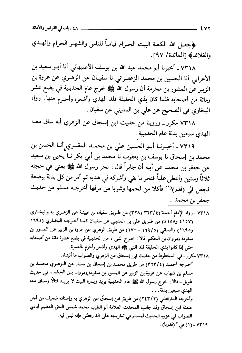 7319 - مكرر ـ وروينا من حديث ابن إسحاق عن الزهري : أنه ساق معه الهدي سبعين بدنة عام الحديبية