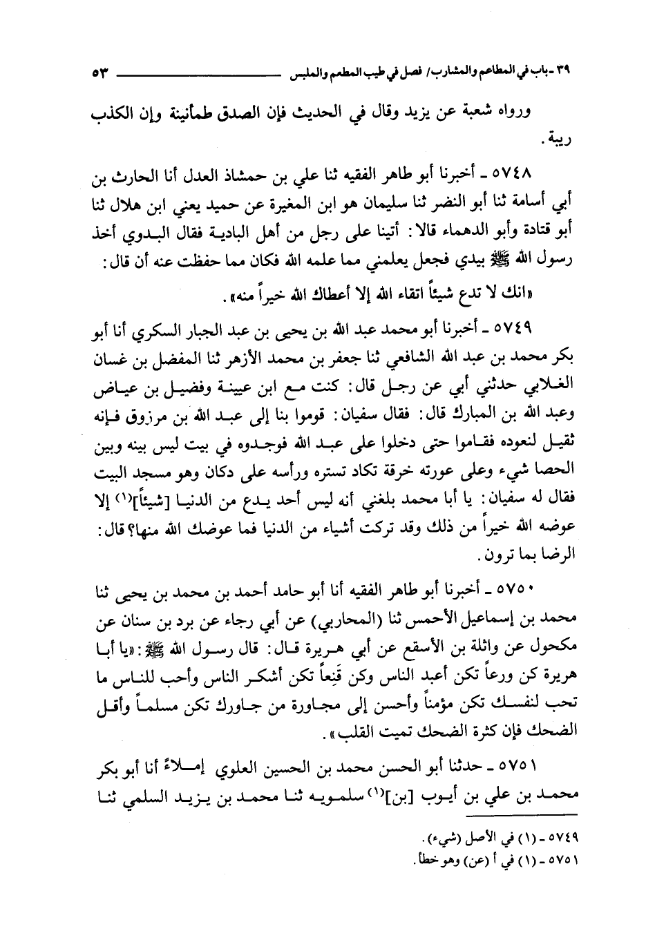 5748 - أخبرنا أبو طاهر الفقيه ثنا علي بن حمشاذ العدل أنا الحارث بن أبي أسامة ثنا أبو النضر ثنا سليمان هو ابن المغيرة عن حميد يعني ابن هلال ثنا أبو قتادة و أبو الدهماء قالا : أتينا على رجل من أهل البادية فقال البدوي أخذ رسول الله صلى الله عليه و سلم بيدي فجعل يعلمني مما علمه الله فكان مما حفظت عنه أنه قال :