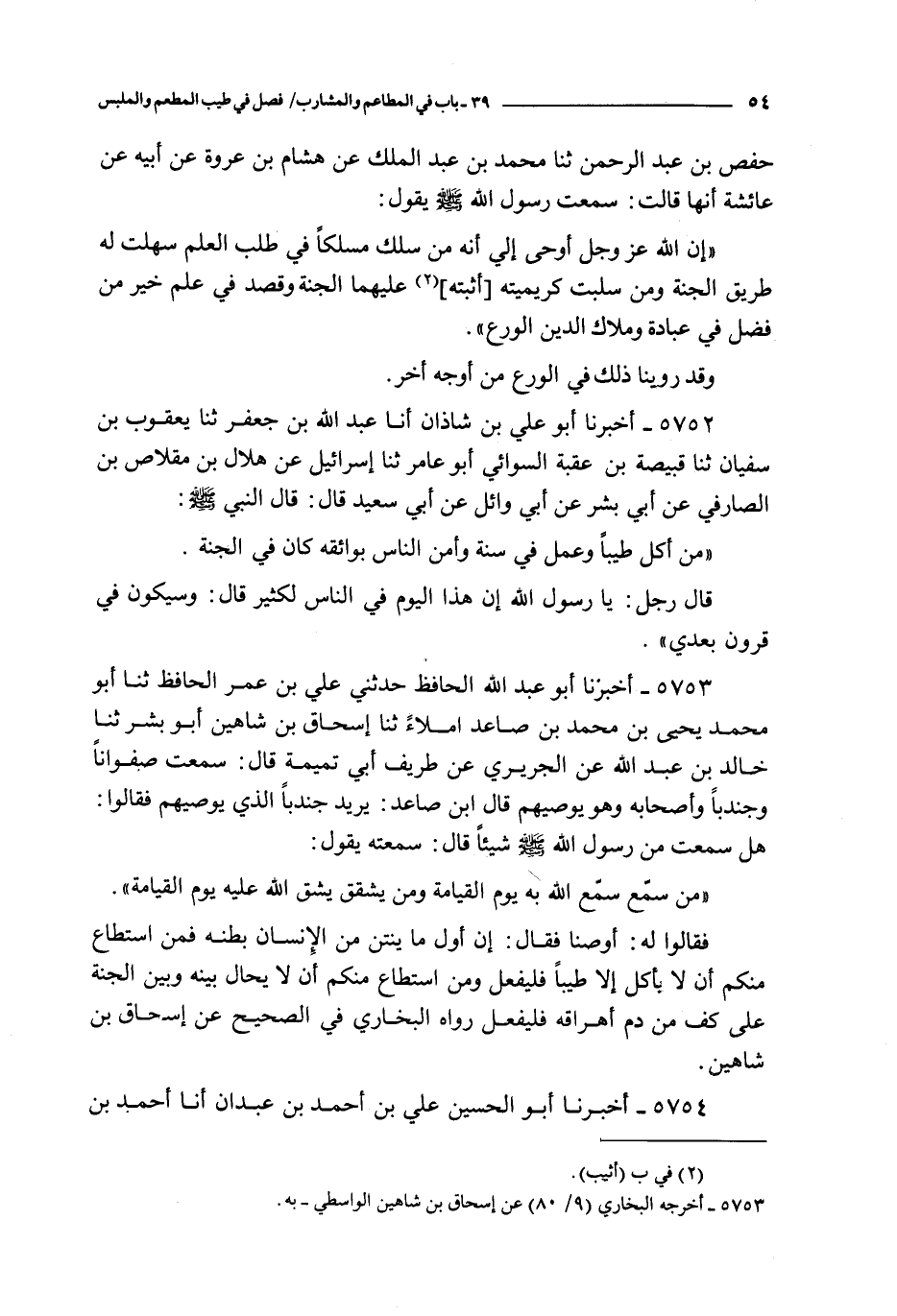 فقالوا له : أوصنا فقال : إن أول ما ينتن من الإنسان بطنه فمن استطاع منكم أن لا يأكل إلا طيبا فليفعل ومن استطاع منكم أن لا يحال بينه وبين الجنة على كف من دم أهراقه فليفعل رواه البخاري في الصحيح عن إسحاق بن شاهين