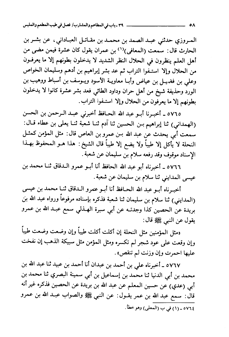 5765 - أخبرنا أبو عبد الله الحافظ أخبرني عبد الرحمن بن الحسن الهمداني ثنا إبراهيم بن الحسين ثنا آدم ثنا شعبة ثنا يعلى بن عطاء قال : سمعت أبي يحدث عن عبد الله بن عمرو العاص قال : مثل المؤمن كمثل النحلة لا يأكل إلا طيبا ولا يضع إلا طيبا قال الشيخ هذا هو المحفوظ بهذا الإسناد موقوف وقد رفعه سلام بن سليمان عن شعبة