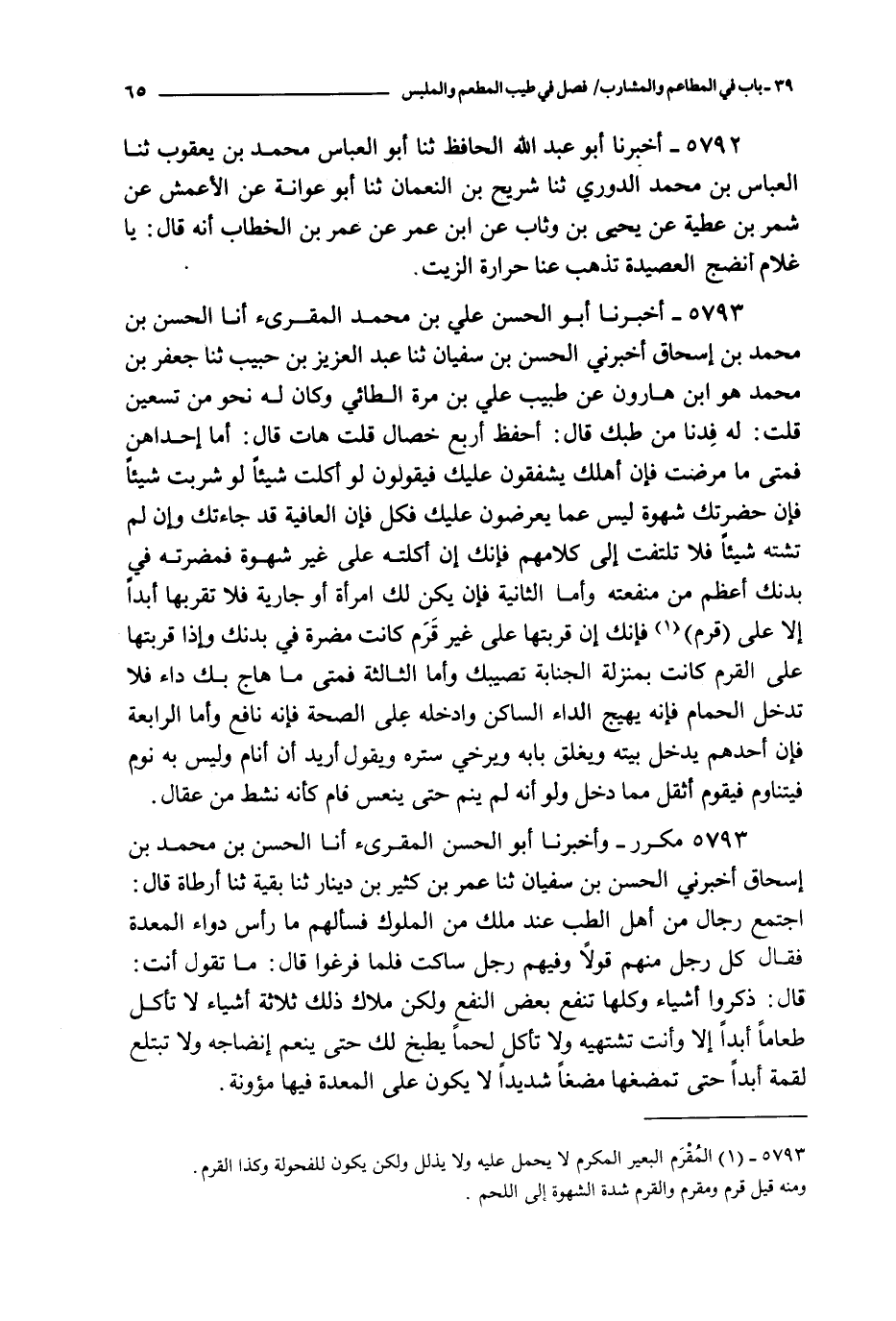 5792 - أخبرنا أبو عبد الله الحافظ ثنا أبو العباس محمد بن يعقوب ثنا العباس بن محمد الدوري ثنا شريح بن النعمان ثنا أبو عوانة عن الأعمش عن شمر بن عطية عن يحيى بن وثاب عن ابن عمر عن عمر بن الخطاب أنه قال : يا غلام أنضج العصيدة تذهب عنا حرارة الزيت