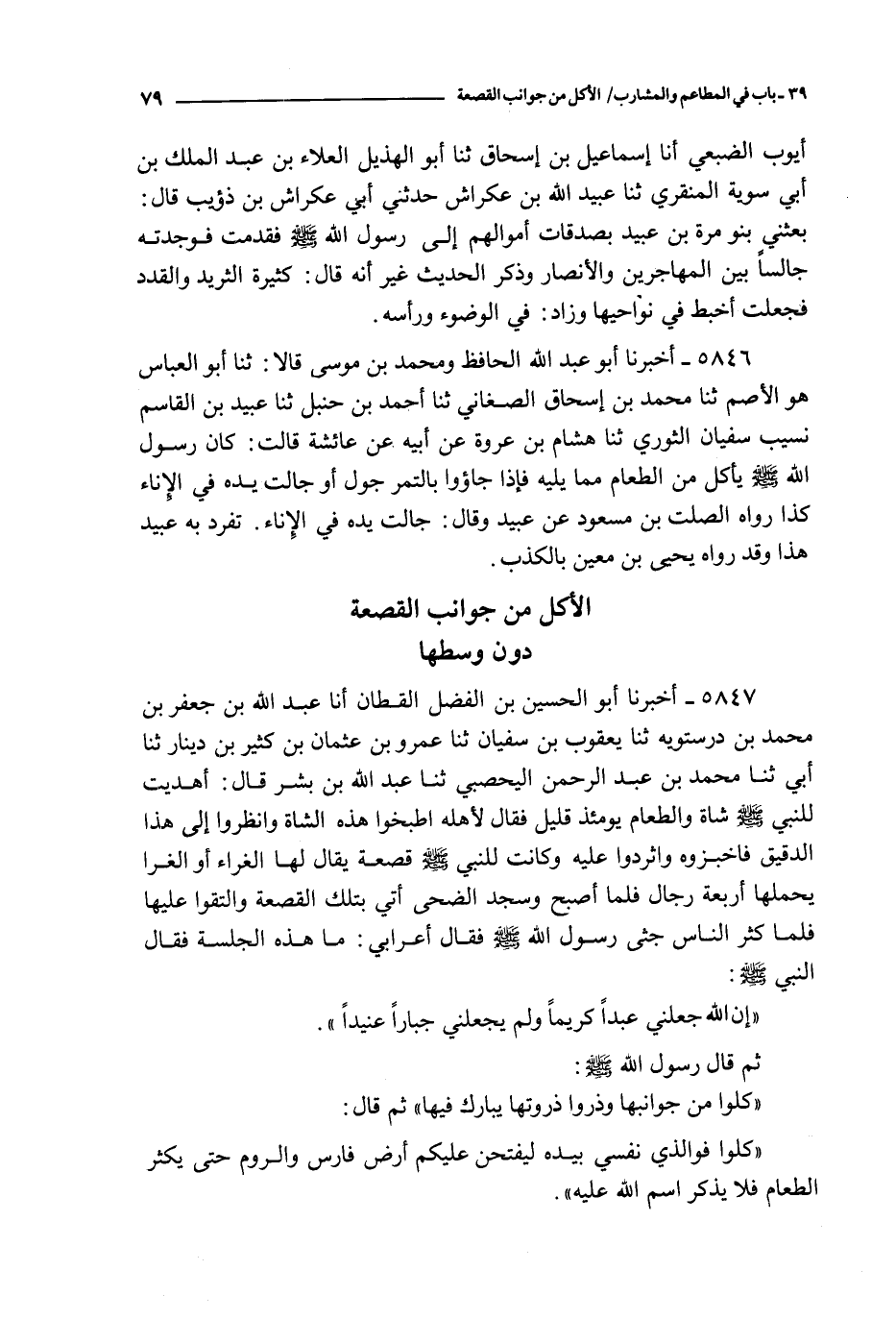 5846 - أخبرنا أبو عبد الله الحافظ و محمد بن موسى قالا : ثنا أبو العباس هو الأصم ثنا محمد بن إسحاق الصغاني ثنا أحمد بن حنبل ثنا عبيد بن القاسم نسيب سفيان الثوري ثنا هشام بن عروة عن أبيه عن عائشة قالت : كان رسول الله صلى الله عليه و سلم يأكل من الطعام مما يليه فإذا جاؤؤا بالتمر جول أو جالت يده في الإناء كذا رواه الصلت بن مسعود عن عبيد وقال : جالت يده في الإناء تفرد به عبيد هذا وقد رواه يحيى بن معين بالكذب