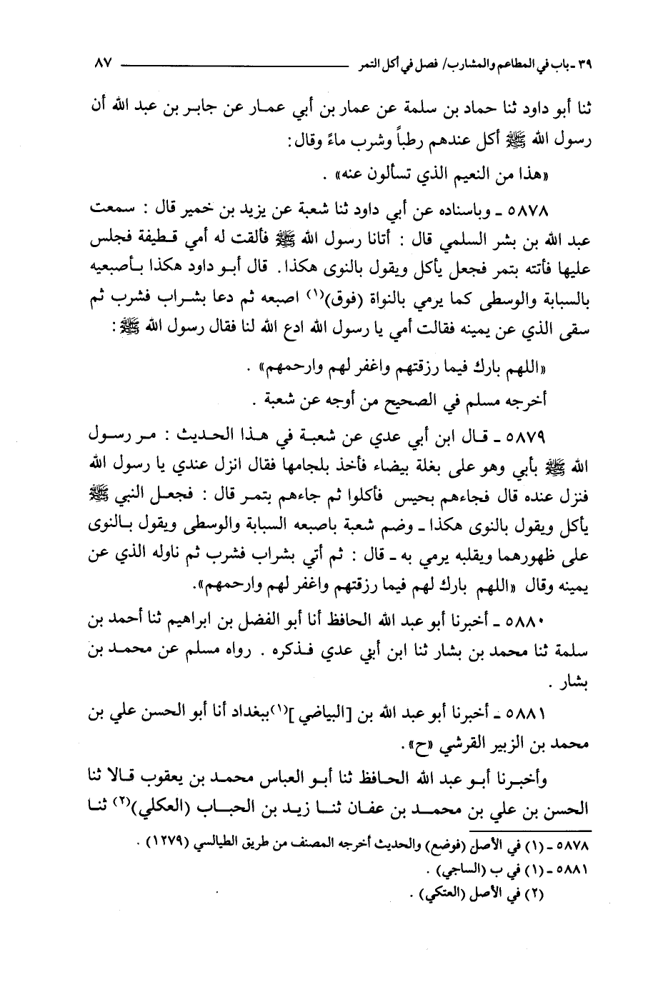 5878 - وبإسناده عن أبي داود ثنا شعبة عن يزيد بن خمير قال : سمعت عبد الله بن بشر السلمي قال : أتانا رسول الله صلى الله عليه و سلم فألقت له أمي قطيفة فجلس عليها فأتته بتمر فجعل يأكل ويقول بالنوى هكذا قال أبو داود بإصبعيه بالسبابة والوسطى كما يرمي بالنواة فوق إصبعه ثم دعا بشراب فشرب ثم سقى الذي عن يمينه فقالت أمي يا رسول الله ادع الله لنا فقال رسول الله صلى الله عليه و سلم :