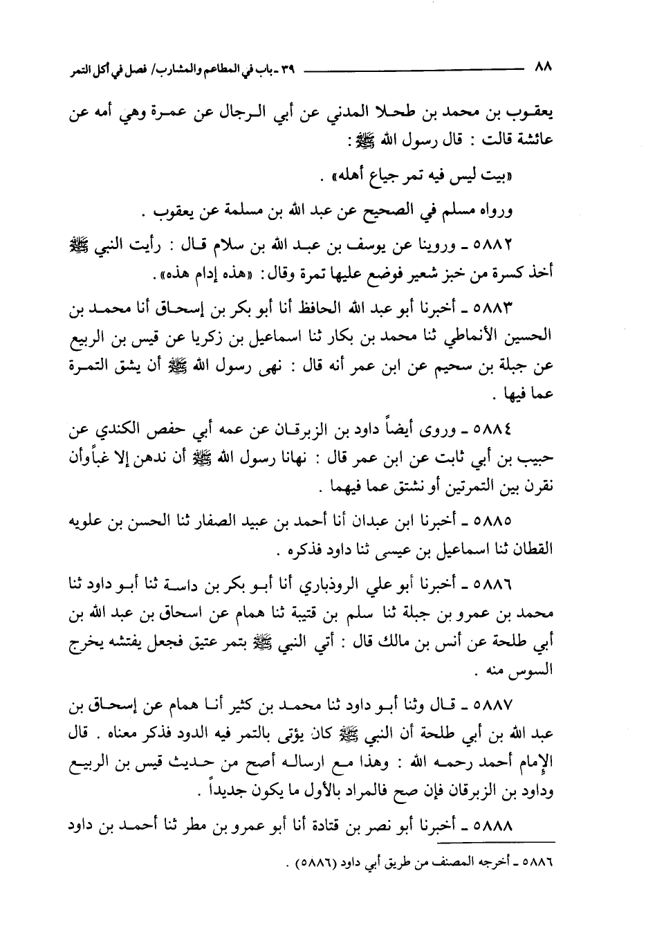 5882 - وروينا عن يوسف بن عبد الله بن سلام قال : رأيت النبي صلى الله عليه و سلم أخذ كسرة من خبز شعير فوضع عليها تمرة وقال : هذه إدام هذه