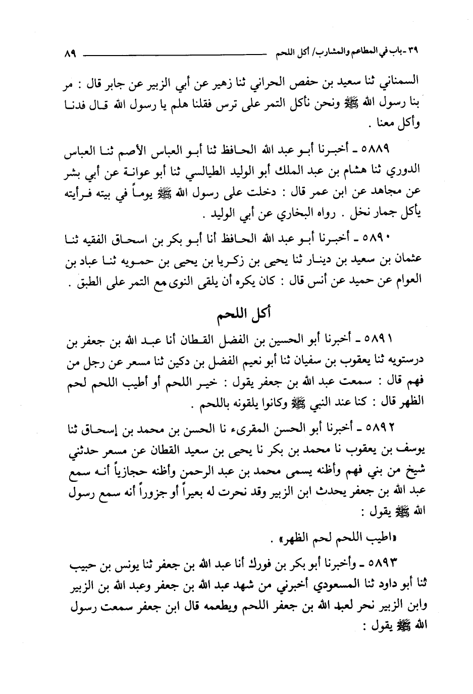 5892 - أخبرنا أبو الحسن المقرئ نا الحسن بن محمد بن إسحاق ثنا يوسف بن يعقوب نا محمد بن بكر نا يحيى بن سعيد القطان عن مسعر حدثني شيخ من بني فهم وأظنه يسمى محمد بن عبد الرحمن وأظنه حجازيا أنه سمع عبد الله بن جعفر يحدث ابن الزبير وقد نحرت له بعيرا أو جزورا : أنه سمع رسول الله صلى الله عليه و سلم يقول :