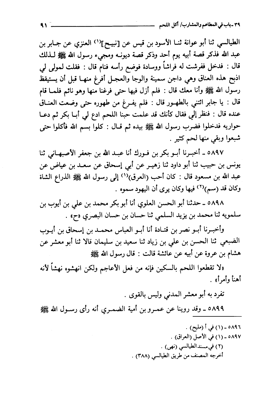 5899 - وقد روينا عن عمرو بن أمية الضمري : أنه رأى رسول الله صلى الله عليه و سلم يحتز من كتف شاة في يده فدعي إلى الصلاة فألقاها والسكين التي كان يحتز بها ثم قام فصلى ولم يتوضأ فيحتمل إن صح حديث أبي معشر أن يكون هذا في لحم لم ينعم نضجه وحديث أبي معشر في لحم قد تكامل نضجه وعلى أن ذلك يكون أطيب كما :
