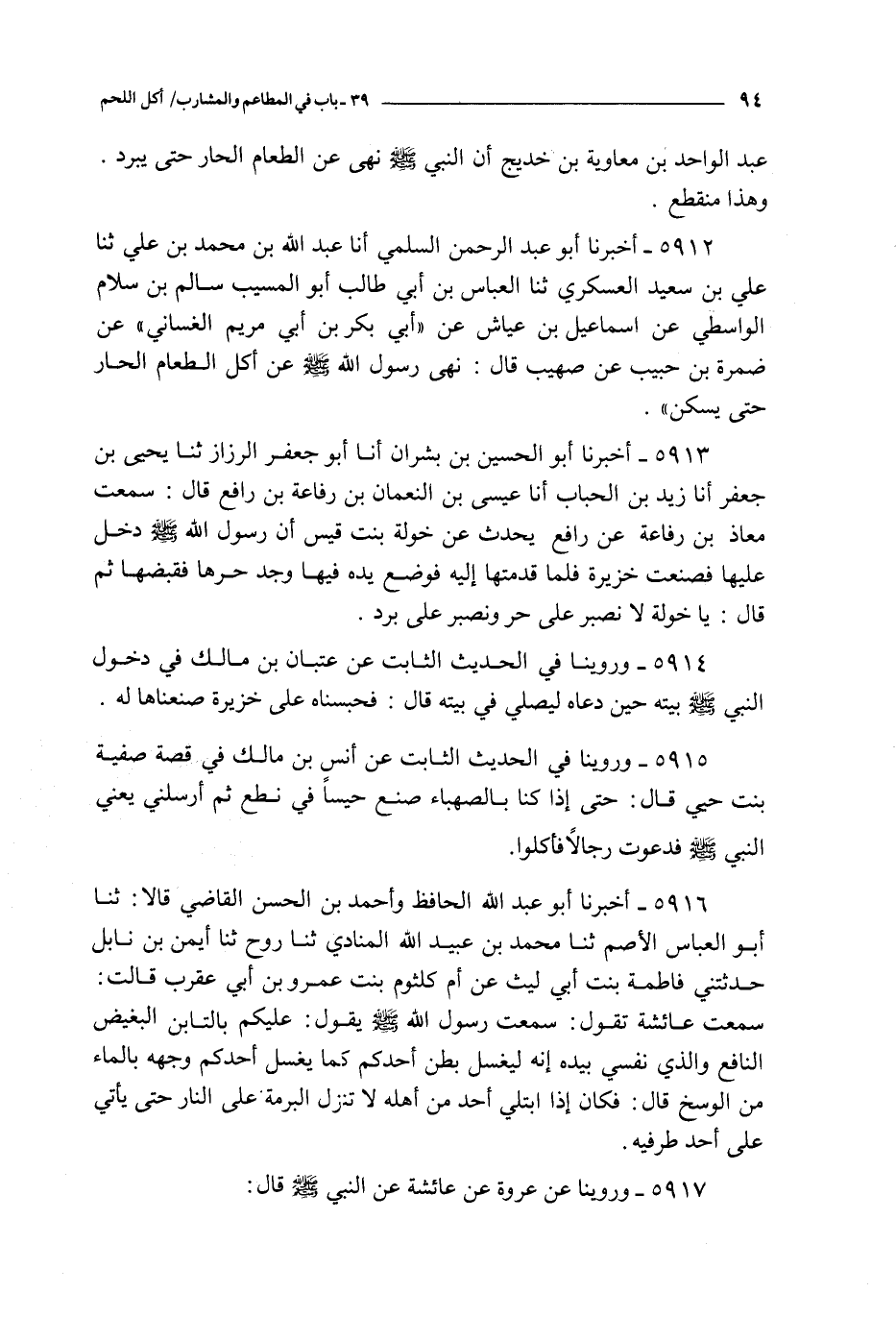 5912 - أخبرنا أبو عبد الرحمن السلمي أنا عبد الله بن محمد بن علي ثنا علي بن سعيد العسكري ثنا العباس بن أبي طالب أبو المسيب سالم بن سلام الواسطي عن إسماعيل بن عياش عن أبي بكر بن أبي مريم الغساني عن ضمرة بن حبيب عن صهيب قال : نهى رسول الله صلى الله عليه و سلم عن أكل الطعام الحار حتى يسكن