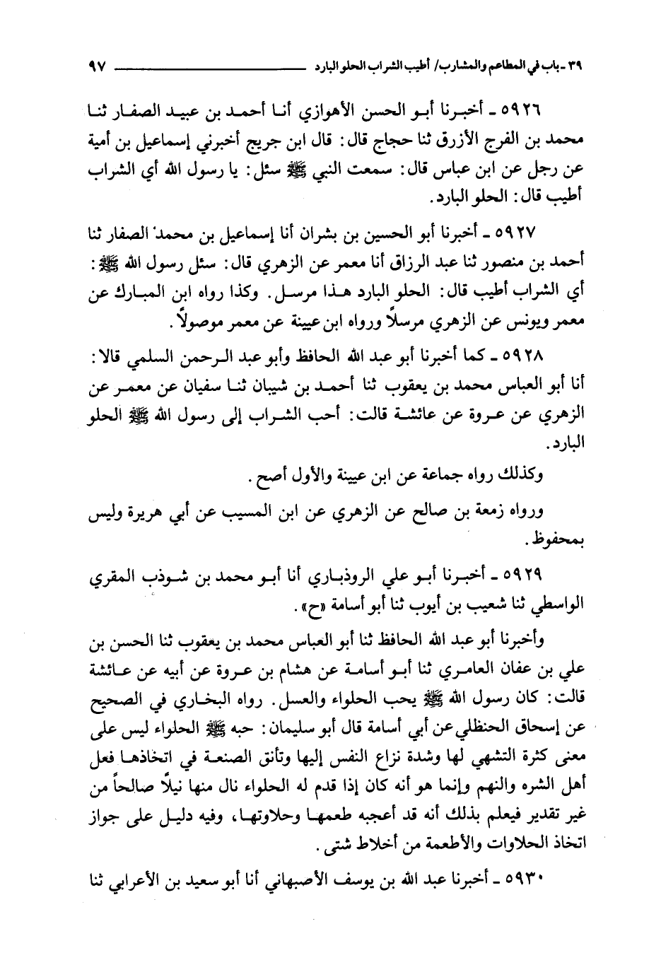 5928 - كما أخبرنا أبو عبد الله الحافظ و أبو عبد الرحمن السلمي قالا : أنا أبو العباس محمد بن يعقوب ثنا أحمد بن شيبان ثنا سفيان عن معمر عن الزهري عن عروة عن عائشة قالت : أحب الشراب إلى رسول الله صلى الله عليه و سلم الحلو البارد