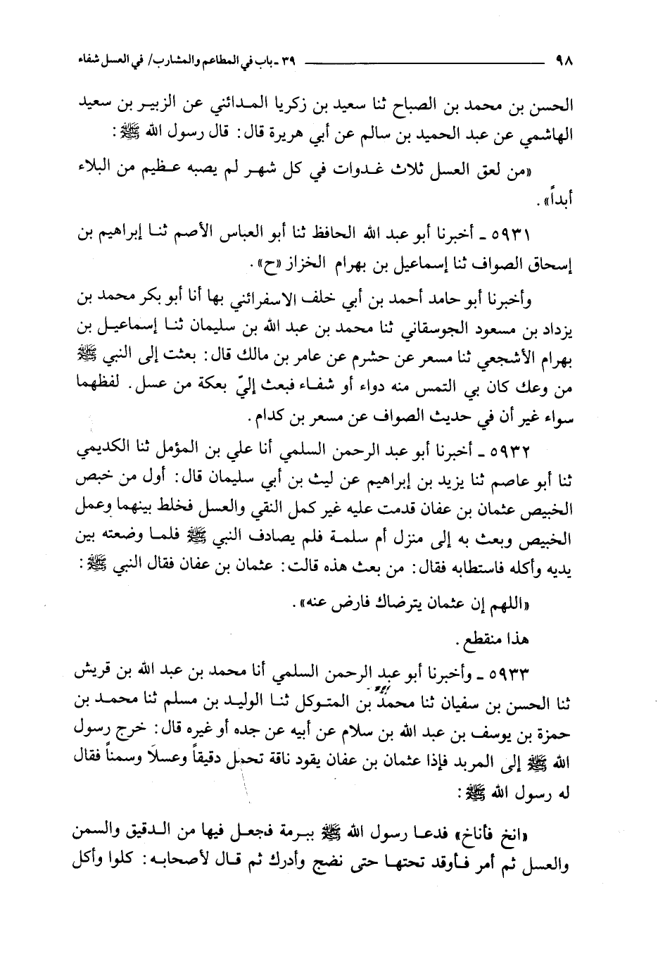 5932 - أخبرنا أبو عبد الرحمن السلمي أنا علي بن المؤمل ثنا الكديمي ثنا أبو عاصم ثنا يزيد بن إبراهيم عن ليث بن أبي سليمان قال : أول من خبص الخبيص عثمان بن عفان قدمت عليه غير كمل النقي والعسل فخلط بينهما وعمل الخبيص وبعث به إلى منزل أم سلمة فلم يصادف النبي صلى الله عليه و سلم فلما وضعته بين يديه وأكله فاستطابه فقال : من بعث هذه قالت : عثمان بن عفان فقال النبي صلى الله عليه و سلم :