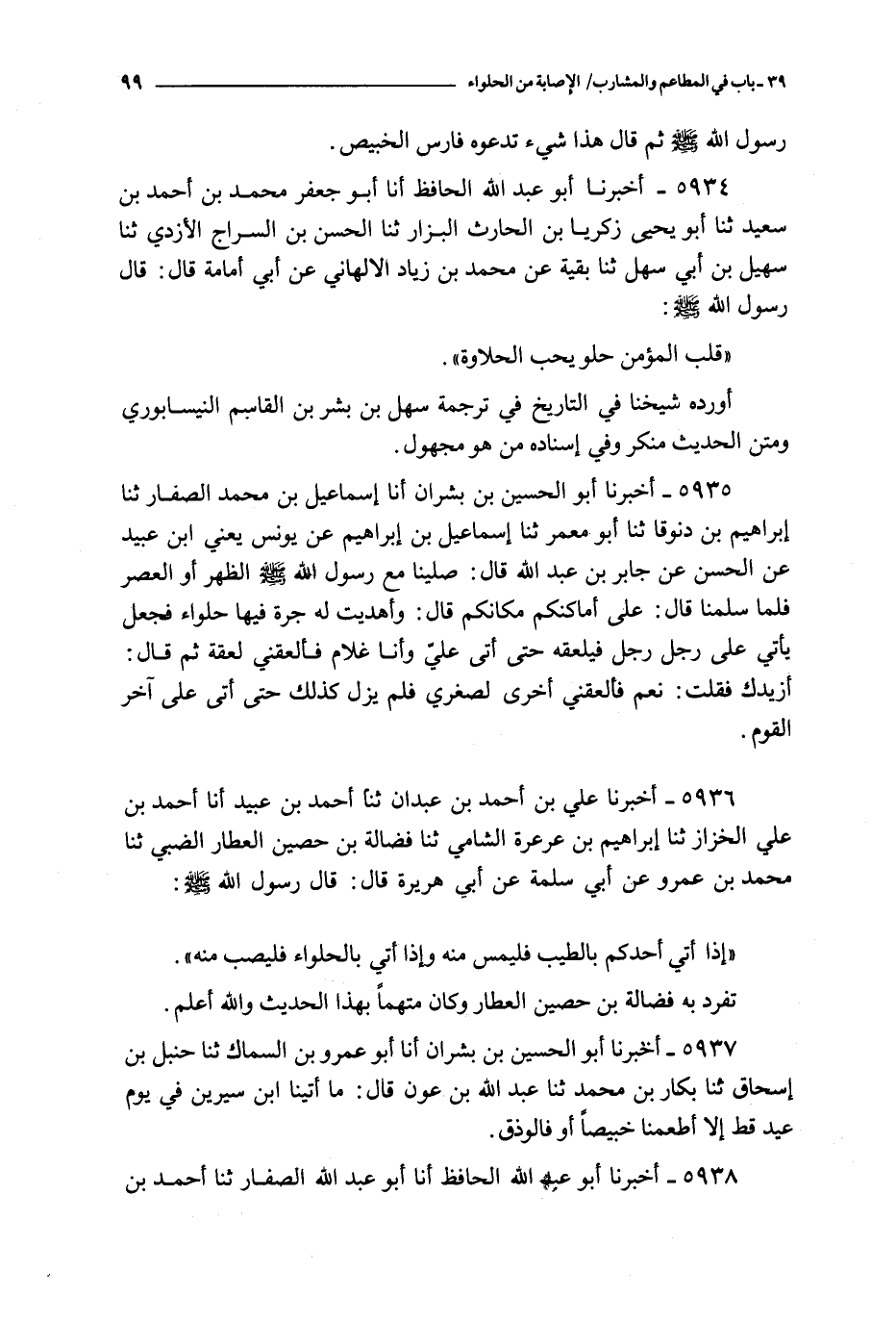 5937 - أخبرنا أبو الحسين بن بشران أنا أبو عمرو بن السماك ثنا حنبل بن إسحاق ثنا بكار بن محمد ثنا عبد الله بن عون قال : ما أتينا ابن سيرين في يوم عيد قط إلا أطعمنا خبيصا أو فالوذق