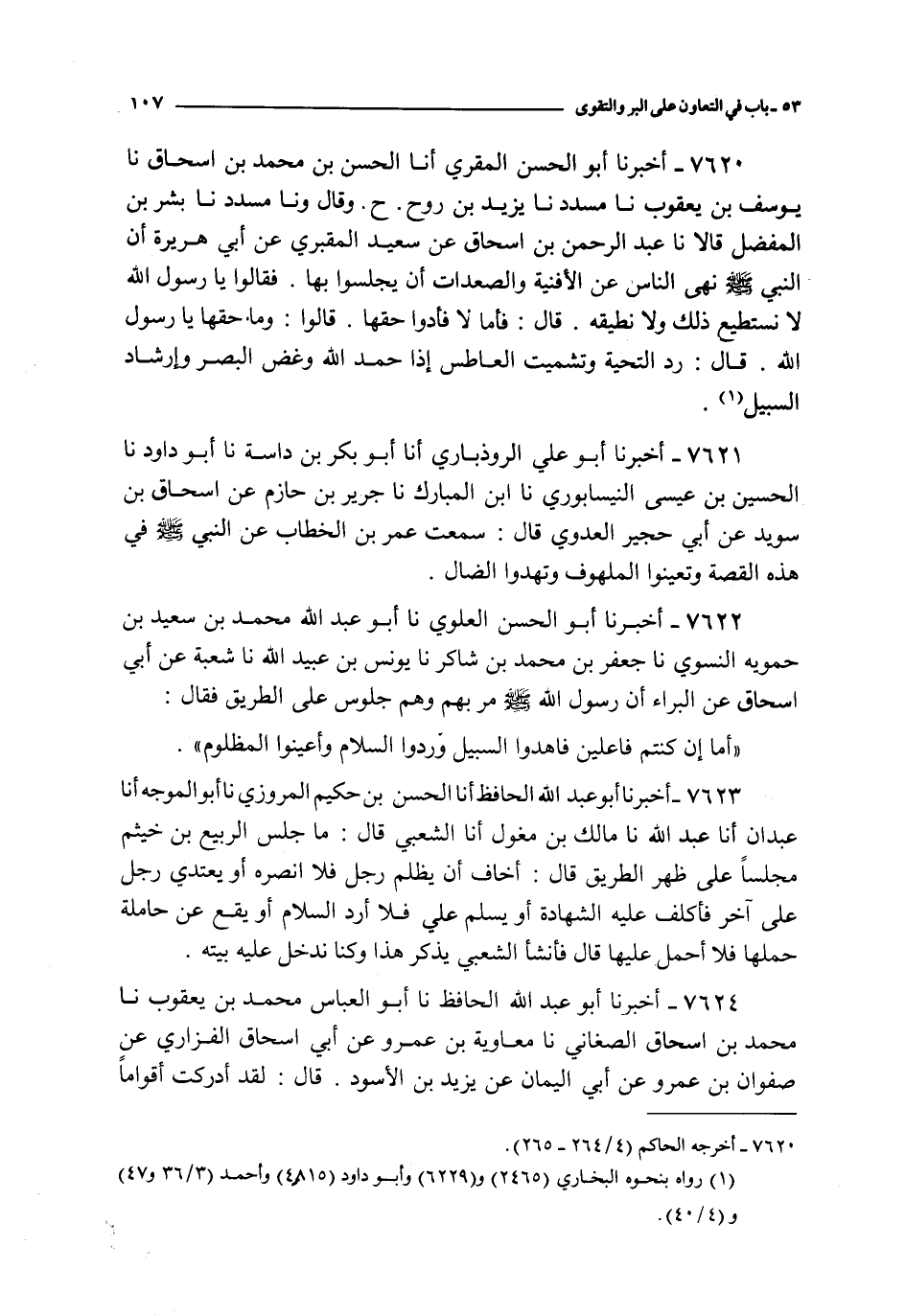 7621 - أخبرنا أبو علي الروذباري أنا أبو بكر بن داسة نا أبو داود نا الحسين بن عيسى النيسابوري نا ابن المبارك نا جرير بن حازم عن إسحاق بن سويد عن أبي حجر العدوي قال : سمعت عمر بن الخطاب : عن النبي صلى الله عليه و سلم في هذه القصة و تعينوا الملهوف و تهدوا الضال