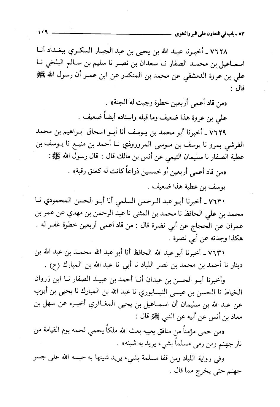 7630 - أخبرنا أبو عبد الرحمن السلمي أنا أبو الحسن المحمودي نا محمد بن علي الحافظ نا محمد بن المثنى نا عبد الرحمن بن مهدي عن عمر بن عمران عن الحجاج عن أبي نضرة قال : من قاد أعمى أربعين خطوة غفر له هكذا وجدته عن أبي نصرة