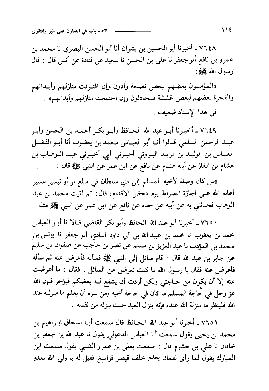 7648 - أخبرنا أبو الحسين بشران أنا أبو الحسن البصري نا محمد بن عمرو بن نافع أبو جعفر نا علي بن الحسن نا سعيد عن قتادة عن أنس قال : قال رسول الله صلى الله عليه و سلم :