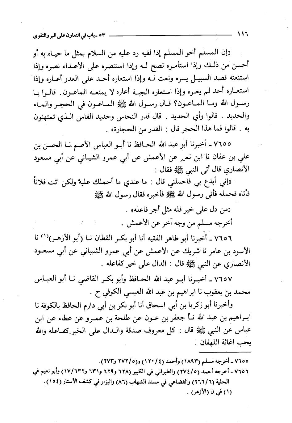 7656 - أخبرنا أبو طاهر الفقيه أنا أبو بكر القطان نا أبو الأزهر نا الأسود بن عامر نا شريك عن الأعمش عن أبي عمرو الشيباني عن أبي مسعود الأنصاري : عن النبي صلى الله عليه و سلم قال : الدال على خير كفاعله