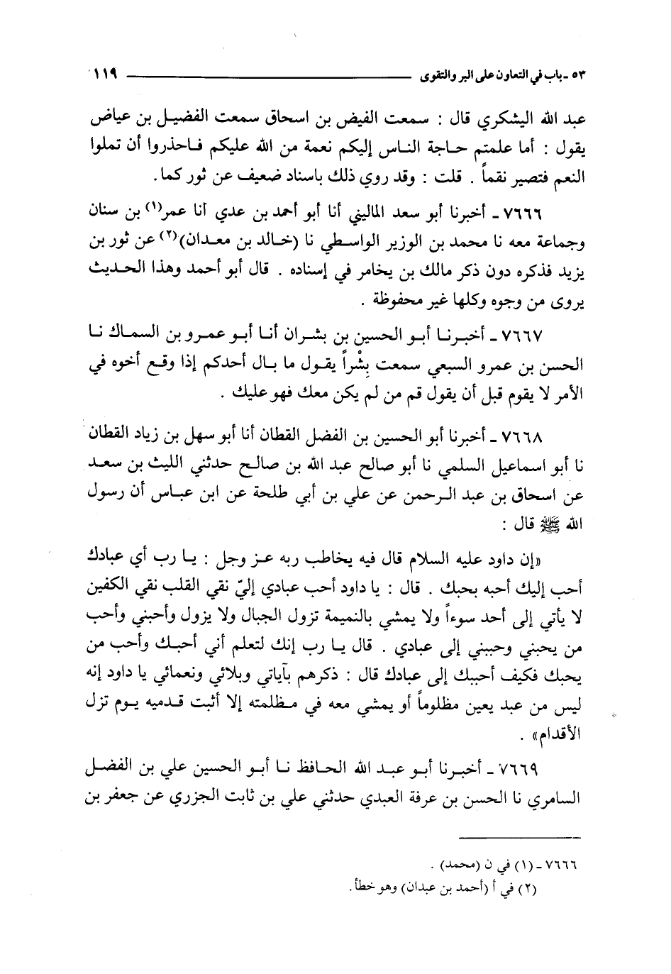 إن داود عليه السلام قال فيه يخاطب ربه عز و جل : يا رب أي عبادك أحب إليك أحبه بحبك قال : يا داود أحب عبادي إلي نقي القلب نقي الكفين لا يأتي إلى أحد سوءا و لا يمشي بالنميمة تزول الجبال و لا يزول و أحبني و أحب من يحبك فكيف أحببك إلى عبادك قال : ذكرهم بآياتي و بلائي و نعمائي يا داود إنه ليس من عبد يعين مظلوما أو يمشي معه في مظلمته إلا أثبت قدميه يوم تزل الأقدام