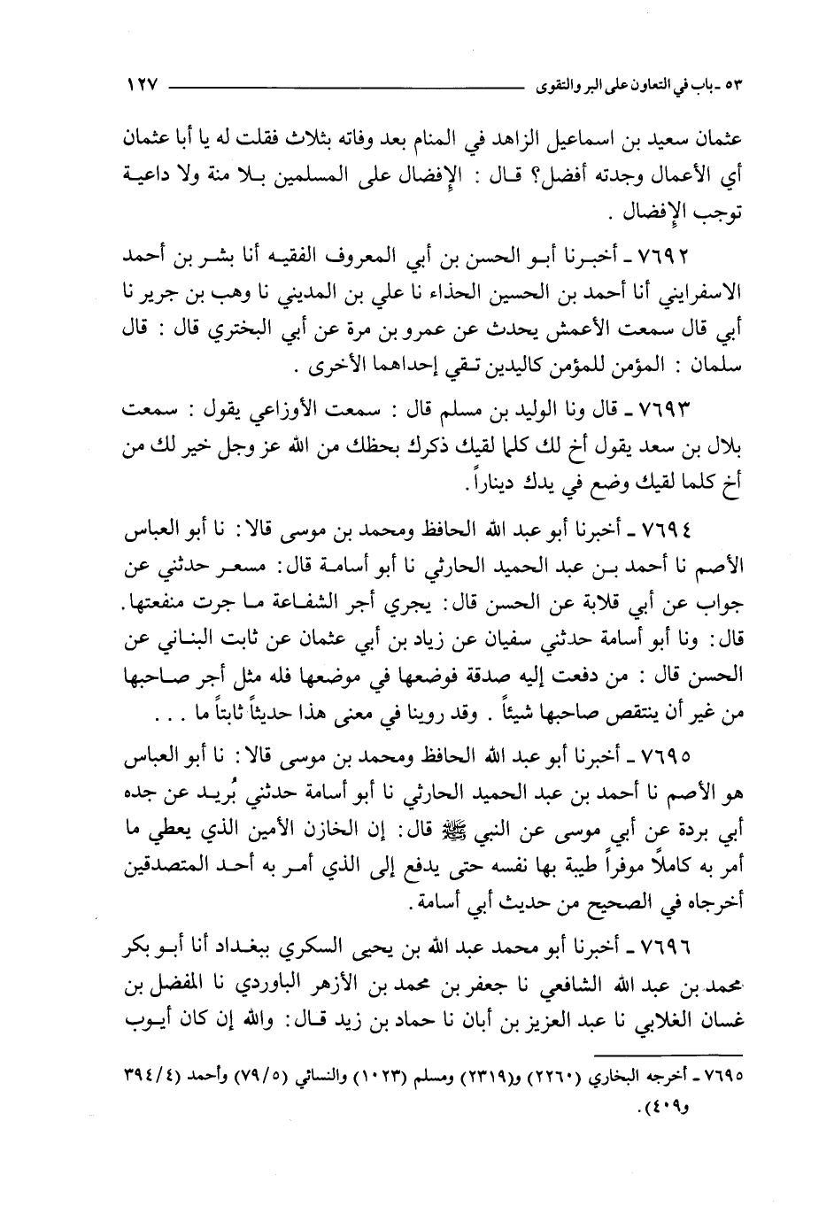 7694 - أخبرنا أبو عبد الله الحافظ و محمد بن موسى قالا : نا أبو العباس الأصم نا أحمد بن عبد الحميد الحارثي نا أبو أسامة قال : مسعر حدثني عن جواب عن أبي قلابة عن الحسن قال : يجري أجر الشفاعة ما جرت منفعتها قال : و نا أبو أسامة حدثني سفيان عن زياد بن أبي عثمان عن ثابت البناني عن الحسن قال : من دفعت إليه صدقة فوضعها في موضعها فله مثل أجر صاحبها من غير أن ينتقص صاحبها شيئا