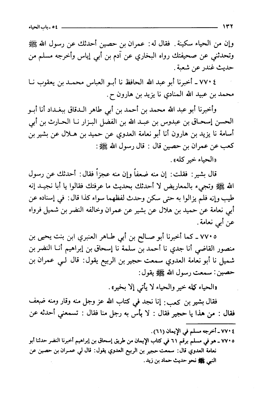 و أخبرنا أبو عبد الله محمد بن أحمد بن أبي طاهر الدقاق ببغداد أنا أبو الحسن إسحاق بن عبدوس بن عبد الله بن الفضل البزاز نا الحارث بن أبي أسامة نا يزيد بن هارون أنا أبو نعامة العدوي عن حميد بن هلال عن بشير بن كعب عن عمران بن حصين قال : قال رسول الله صلى الله عليه و سلم :