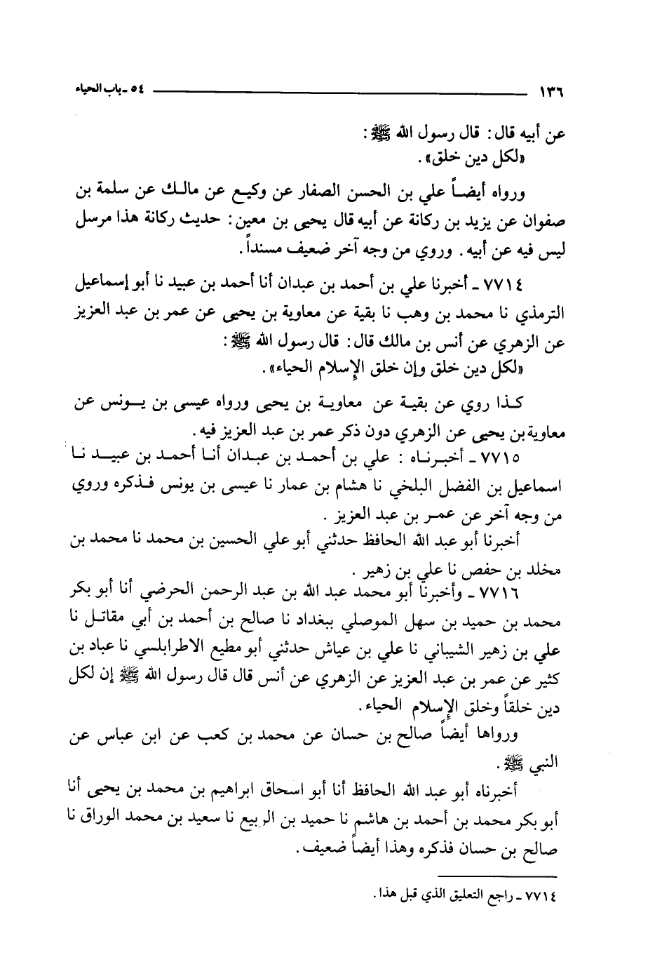 7716 - و أخبرنا أبو محمد عبد الله بن عبد الرحمن الحرضي أنا أبو بكر محمد بن حميد بن سهل الموصلي ببغداد نا صالح بن أحمد بن أبي مقاتل نا علي بن زهير الشيباني نا علي بن عياش حدثني أبو مطيع الاطرابلسي نا عباد بن كثير عن عمر بن عبد إبراهيم العزيز عن الزهري عن أنس قال : قال رسول الله صلى الله عليه و سلم إن لكل دين خلقا و خلق الإسلام الحياء