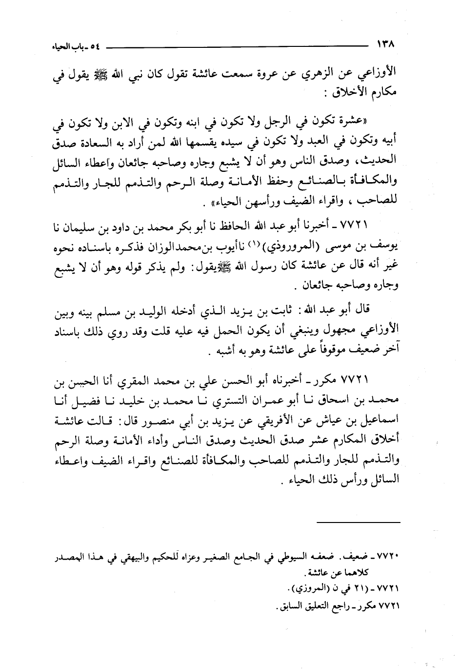 7721 - أخبرنا أبو عبد الله الحافظ نا أبو بكر محمد بن داود بن سليمان نا يوسف بن موسى المروروذي نا أيوب بن محمد الوزان : فذكره بإسناده نحوه غير أنه قال عن عائشة كان رسول الله صلى الله عليه و سلم يقول : و لم يذكر قوله و هو أن لا يشبع و جاره و صاحبه جائعان