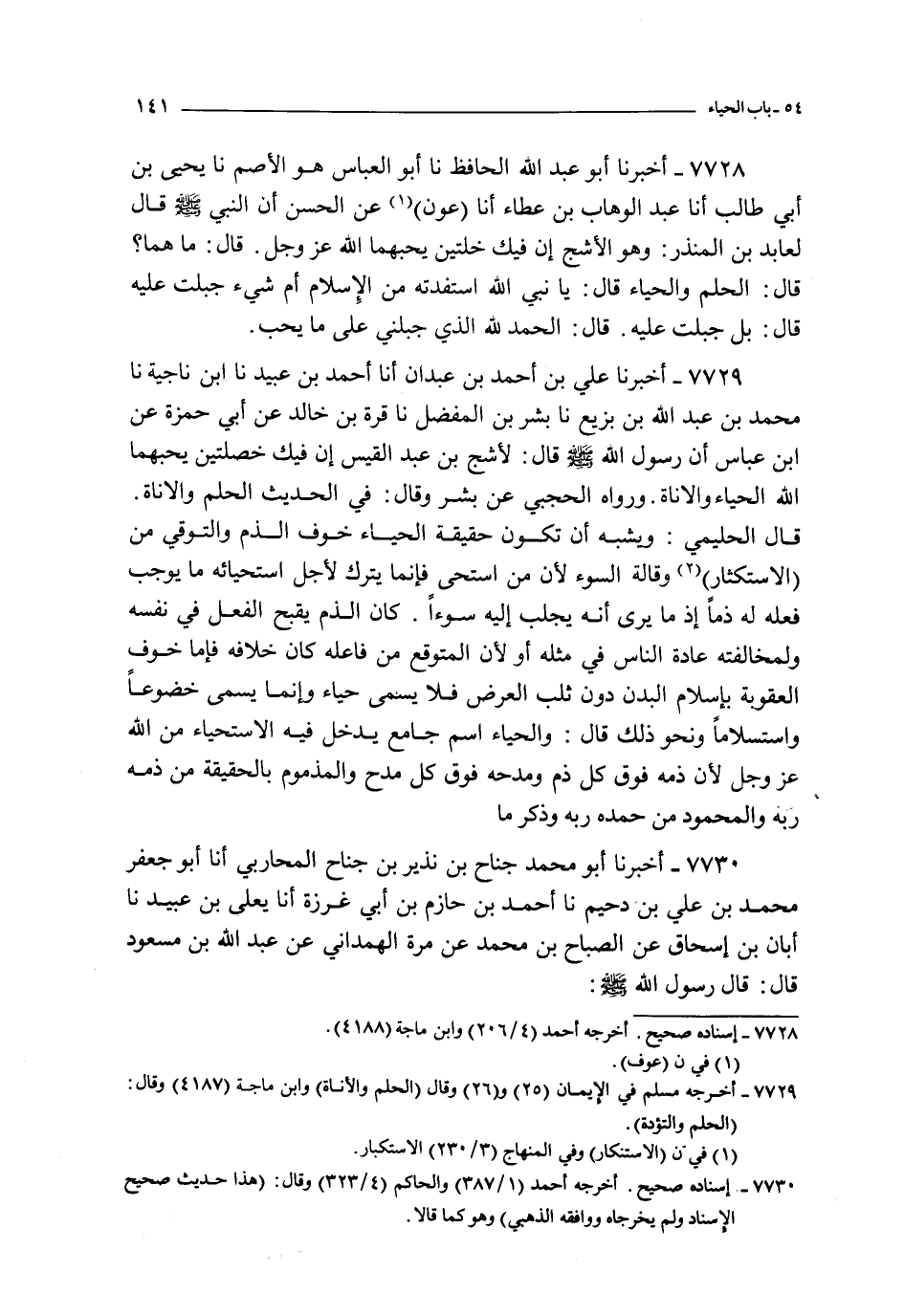 7729 - أخبرنا علي بن أحمد بن عبدان أنا أحمد بن عبيد نا ابن ناجية نا محمد بن عبد الله بن بزيع نا بشر بن المفضل نا قرة بن خالد عن أبي حمزة عن ابن عباس : أن رسول الله صلى الله عليه و سلم قال : لأشج بن عبد القيس إن فيك خصلتين يحبهما الله الحياة و الأناة و رواه الحجبي عن بشر و قال : في الحديث الحلم و الأناة قال الحليمي : و يشبه أن تكون حقيقة الحياء خوف الذم و التوقي من الاستكثار و قاله السوء لأن من استحى فإنما يترك لأجل استحيائه ما يوجب فعله له ذما إذ ما يرى أنه يجلب إليه سوءا كان الذم يقبح الفعل في نفسه و لمخالفته عادة الناس في مثله أو لأن المتوقع من فاعله كان خلافه فإما خوف العقوبة بإسلام البدن دون ثلب العرض فلا يسمى حياء و إنما يسمى خضوعا و استسلاما و نحو ذلك قال : و الحياء اسم جامع يدخل فيه الاستحياء من الله عز و جل لأن ذمه فوق كل ذم و مدحه فوق كل مدح و المذموم بالحقيقة من ذمه ربه و المحمود من حمده ربه و ذكر ما