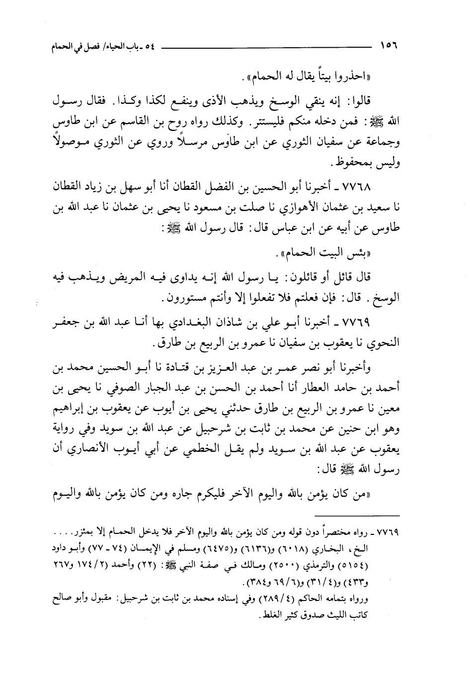 من كان يؤمن بالله و اليوم الآخر فليكرم جاره و من كان يؤمن بالله و اليوم الآخر فليكرم ضيفه و من كان يؤمن بالله و اليوم الآخر فليقل خيرا أو ليصمت و من كان يؤمن بالله و اليوم الآخر فلا يدخل الحمام إلا بمئزر و من كان يؤمن بالله و اليوم الآخر من نسائكم فلا يدخلن الحمام