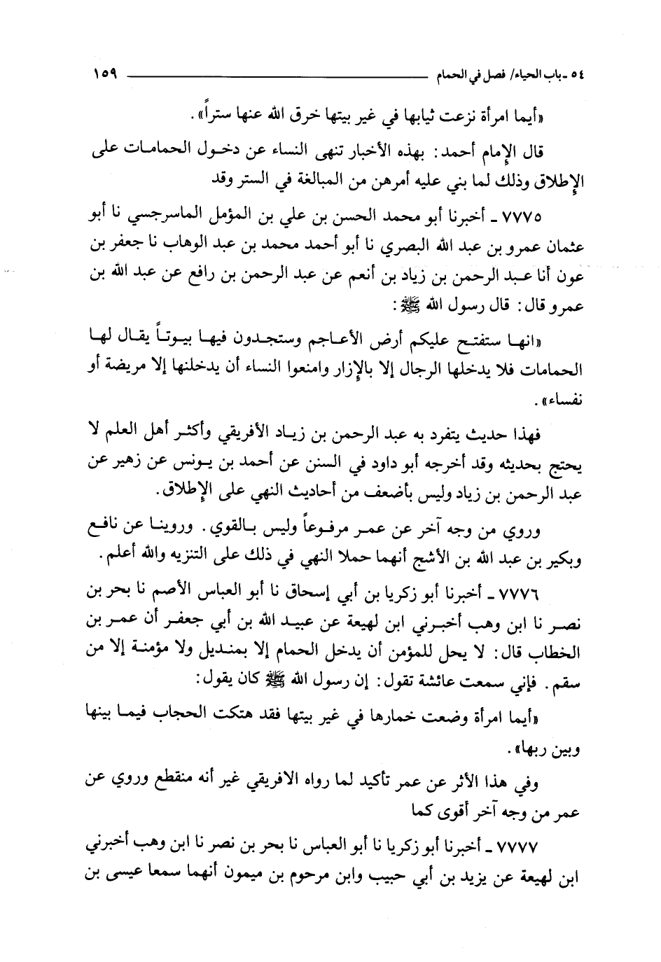 7777 - أخبرنا أبو زكريا نا أبو العباس نا بحر بن نصر نا ابن وهب أخبرني ابن لهيعة عن يزيد بن أبي حبيب و ابن مرحوم بن ميمون أنهما سمعا عيسى بن سيلان يقول : سمعت قبيصة بن ذؤيب يقول : سمعت عمر بن الخطاب يقول : لا يحل لرجل يدخل الحمام إلا بمئزر و لا يحل لامرأة أن تدخل الحمام فقام رجل فقال : لقد منعتها من حين سمعتك تنهى عن ذلك و إنها لسقيمة فقال عمر : إلا من سقم