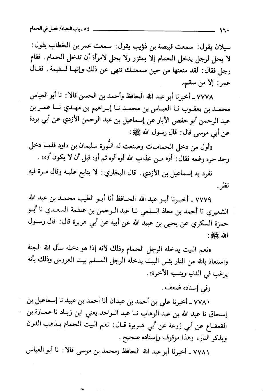 7781 - أخبرنا أبو عبد الله الحافظ و محمد بن موسى قالا : نا أبو العباس الأصم نا يحيى بن أبي طالب أنا عبد الوهاب بن عطاء أنا قرة بن خالد أخبرني عطية الجدلي عن ابن عمر قال : نعم البيت الحمام يذهب الوسخ و يذكر النار